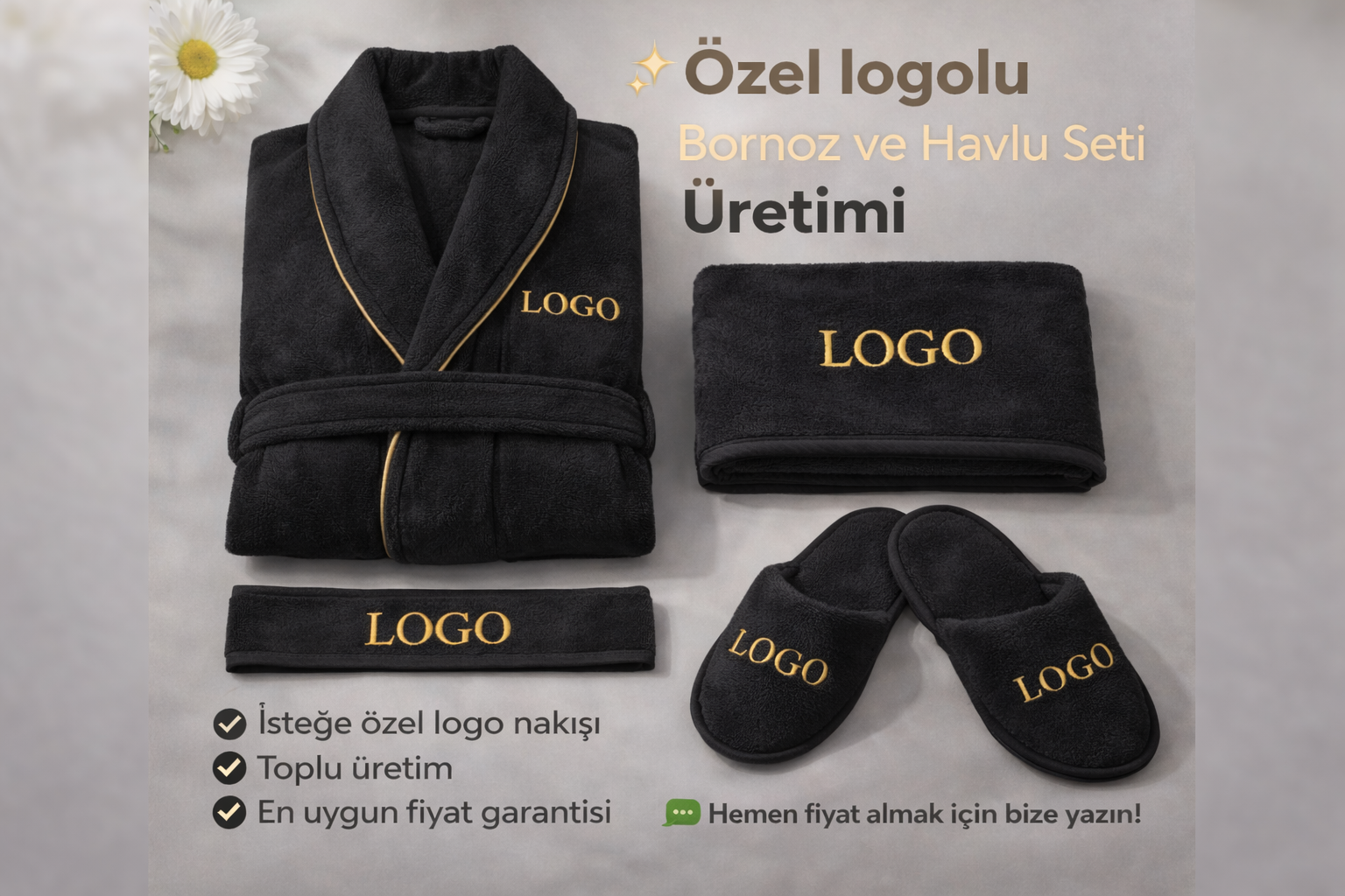 Özel logolu bornoz takımı üretimi hizmetimiz ile markanızı profesyonel şekilde yansıtın.