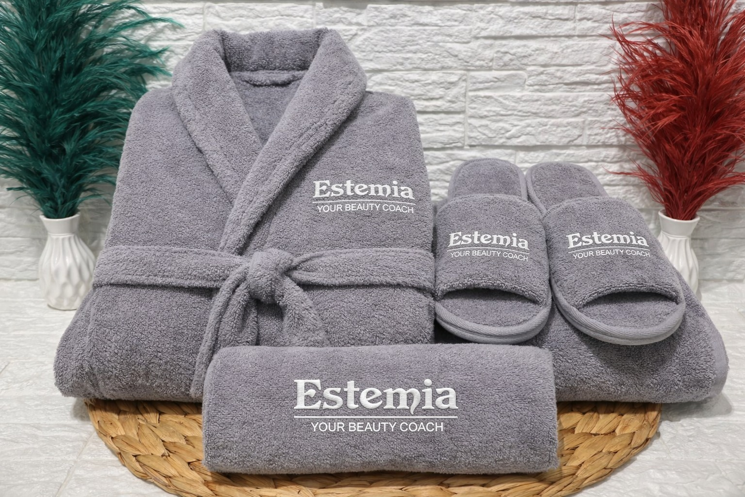 Bornoz, havlu ve terlikten oluşan setlerimiz; spa, otel, güzellik merkezi, klinik ve