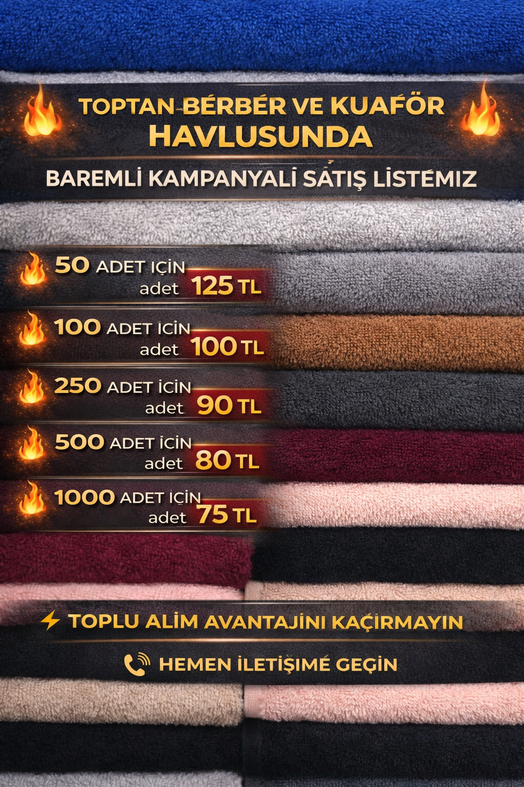 Üreticiden direkt satış avantajıyla profesyonel kullanıma uygun berber ve kuaför havlularında baremli kampanyamız başladı.